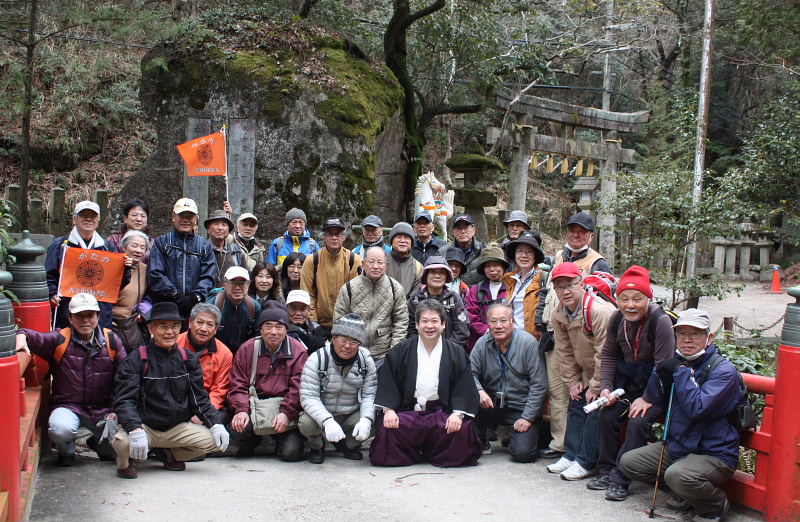 | 磐船神社で記念撮影 西角宮司を囲んで 撮影は、平田政信氏 ![]() |