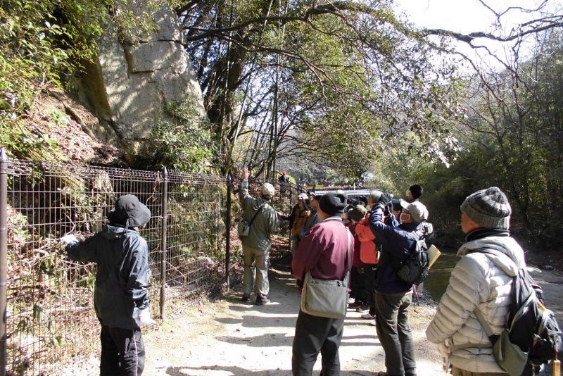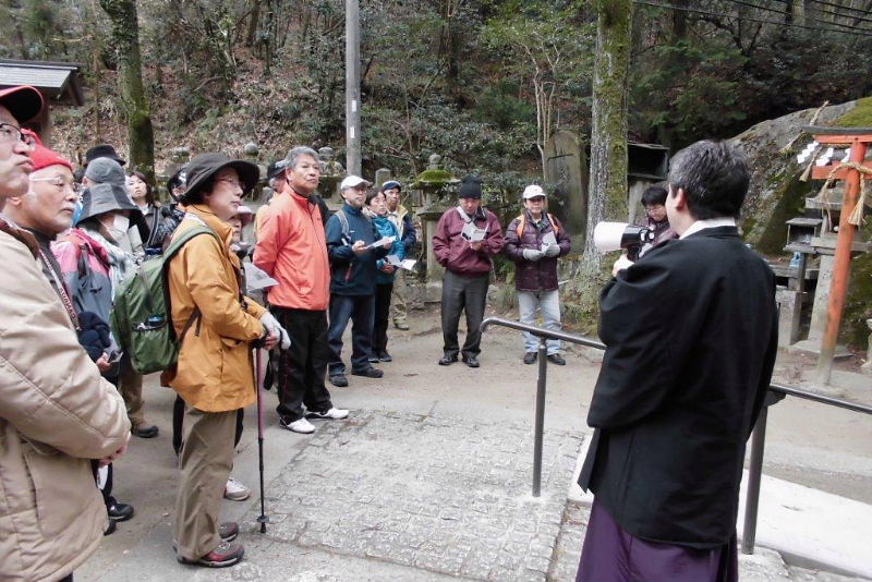 | 3月8日(土)古文化同好会歴史健康ウオーク、午前9時私市駅集合。 当日は好天にも恵まれ会員25名、一般参加13名で38名が参加される盛況でした。 本日の案内役、高尾秀司さんより行程の説明のあと、真鍋成史さんの挨拶、文化財バス見学会の案内の後全員元気に出発。まず弘安地蔵に案内、平田政信さんのユーモア溢れる解説を愉快にきかせてもらい、御幸橋から水辺プラザに入り天野川の国登録文化財である砂防堰堤と加賀田用水について平田さんの解説をうける。 ここからスポレクを通り天野川沿いにピトンの小屋までひたすら歩く。小屋で小休止のあと真鍋成史さんより哮ヶ峰への物部の祖先である饒速日命の降臨、随行者などの解説をうける。星のブランコで高尾秀司氏から簡単な説明を受けたあと、一気に磐船神社へとむかいました。 磐船神社では、予め真鍋さんから西角宮司に連絡して頂いていたお蔭で昼食後、詳しく神社の由緒を聞くことが出来ました。特に印象に残ったのは宝永年間大和田原・河内田原・私市・星田がもめごとで分裂したとき、この神社は廃社同然となり明治まで続くが磐船の「ご神体」だけは、ちゃんと残っていたので復活でき昭和になり社殿などが整えられようやく復興することができた。と語られていました。 そのあと希望者十数名は岩窟巡りでスリルを味わわれ、またパワーをもらい、解散いたしました。 解散後、希望者12~3名で新生なった生駒ミュージアムを訪れ、北野館長より詳しく説明をうけました。建物は昭和8年に建てられた和風建築で生駒町役場の庁舎であったそうで、現在国登録文化財になっています。 真鍋さんには今回の歴史ウォークに先立ち、磐船神社の西角宮司さんと打ち合わせていただき、また、特別企画の「生駒ミュージアム」見学など、当日はスムーズに開催できました。重ねて御礼申し上げます。 また、「肩野物部氏と磐船神社」」のレジメの掲載を快諾下さり有難うございました。 当日の案内、写真撮影などいろいろと高尾秀司さんには大変お世話をお掛け致しましたこと感謝申し上げます。 |