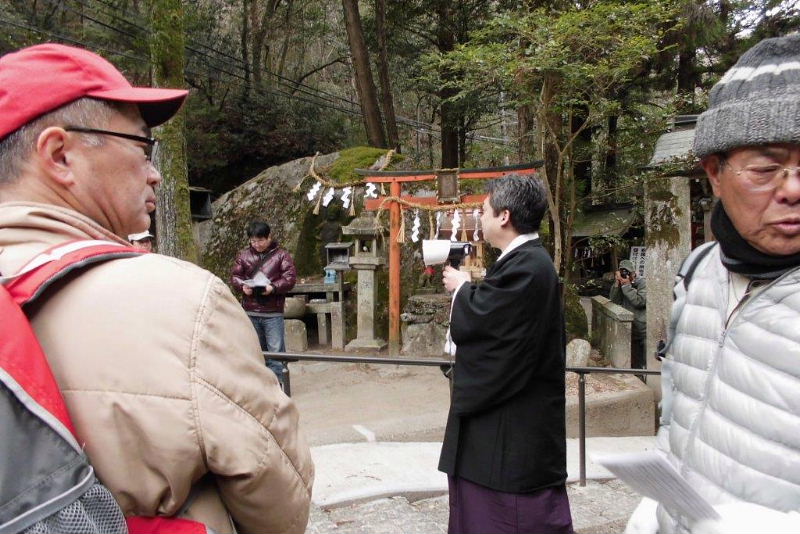 | 磐船神社では、予め真鍋さんから西角宮司に連絡して頂いていたお蔭で昼食後、詳しく神社の由緒を聞くことが出来ました。特に印象に残ったのは宝永年間大和田原・河内田原・私市・星田がもめごとで分裂したとき、この神社は廃社同然となり明治まで続くが磐船の「ご神体」だけは、ちゃんと残っていたので復活でき昭和になり社殿などが整えられようやく復興することができたと、語られていました。 | |||||||