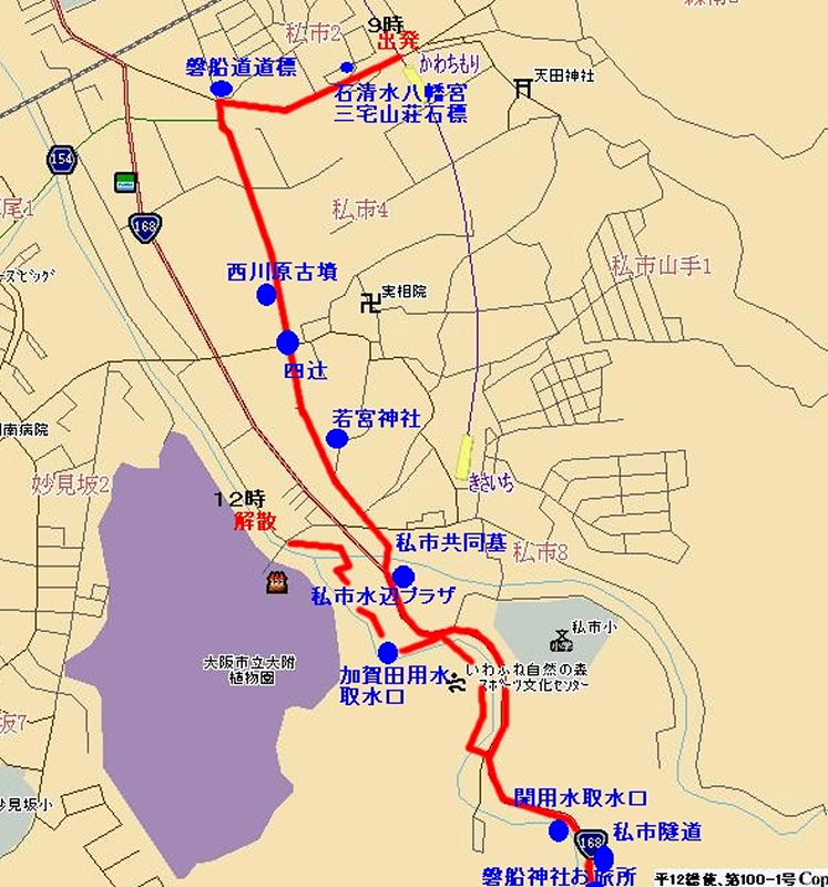 | 行程;京阪河内森駅→大松・道標→磐船街道→西川原古墳(平田菜園内)→ 四辻→私市共同墓→私市隧道→お旅所→私市水辺プラザ 12時頃解散 徒歩 約 5Km |