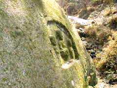 この山道を更に、登ると左に傾いた大石がある。その上部切り込みの光背の中に阿弥陀三尊(第三石仏)が刻まれている。