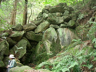 | 地獄谷の聖滝とも呼ばれている滝の下で なすび谷の滝の下に、家ぐらいの大きな「なすび石」があった。 江戸時代の絵図に真っ黒な大きな「なすび石」が描かれているが、今は無い。 30個ばかりに砕かれて各家の庭石と化したらしい? |