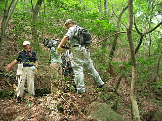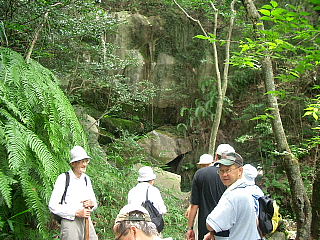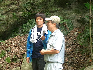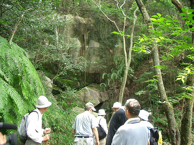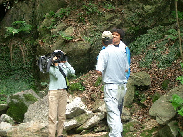 | 7/24、午前10時枚方のケーブルテレビK-CATが、交野歴史健康ウォークで散策したことのある「星田の地獄谷」の取材に訪れた。 当日は、交野古文化同好会の有志の皆さんが参加され取材に協力された。 案内役は平田さん。テレビカメラの前で平田さんと和久田さんの説明は順調に進んだ。 「地獄とは、どんな所ですか?」 「地獄谷って本当にあるんですか?」 「地獄とは?この世の世界ではない、あの世の世界、草木が一本とてない荒涼たる様は三途の川の光景が想像される場所を地獄と呼ばれる。ここ星田の地獄谷は、この谷を歩いた人は、谷が深くて狭く、その深い谷を歩いていると一種異様な雰囲気になり、一刻も早く抜け出たい衝動に駆られる。 なにか陰気な、居てもたってもいられない気分になります。はじめて一人で歩いていたら、途中で引き返すでしょう。なにかゾクゾクする感じがする谷筋だ。だから人のあまり立ち寄らない、村人に恐れられた場所として忌み嫌うので、昔から死牛馬等の捨て場所ともなっていたようだ。