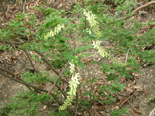 | 地獄谷で見つけた珍しい夏藤(なつふじ)の花 本州(関東地方以西)、四国、九州の、丘陵から低い山地の林縁や 明るい樹林内に生える日本固有のマメ科のつる性落葉木本。花期は7〜8月。 新枝の葉の脇から長さ10〜20cmの総状花序が垂れ下がり、 淡黄白色の蝶形花を多数つける。旗弁と翼弁はともに長さ1.2〜1.3cm。 |