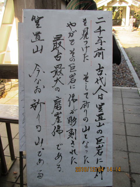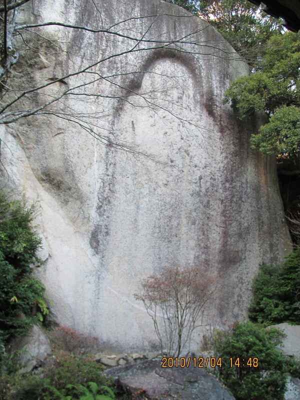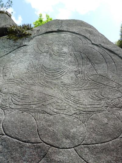 磨崖仏は高さ約15メートル、最大幅は約12メートル。奈良時代の作とみられ、花こう岩に線で彫られた。元弘の変(1331年)の戦火などで、現在では頭頂部など一部を除き、ほとんど姿が消えてしまっている。