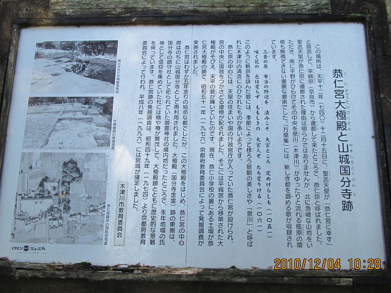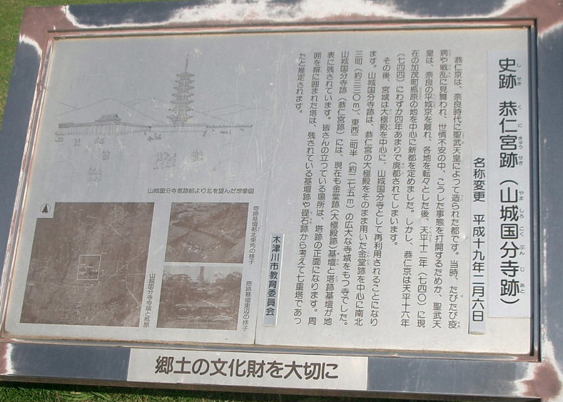 宮跡は昭和48年(1973)から発掘調査が行われ、大極殿や建物遺構が発見されている。平成5年(1993)には宮城門も見つかつている。恭仁宮には後に山城国分寺(国史跡)が移された。全国に国分寺造営の詔が出されたのが天平13年(741)2月であるが、山城の国分寺の造立の時期や当初の場所・規模については確かなことは不明で、天平15年(743)正月に聖武天皇が高僧を招いて金光最勝王経を誦読させており、この頃には完成したと考えられる。