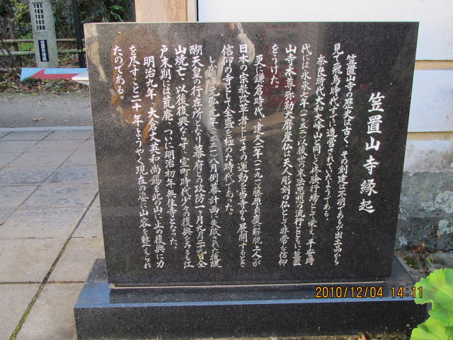元弘元年(1331)後醍醐天皇は京都を逃れ、東大寺別当尋尊を頼んで笠置山に来て寺を行在所とし、寺を中心に笠置城とし、近在の武士農民を集めて当山衆徒の助けを得て幕府軍と戦ったが、約1カ月で敗れ寺は焼かれた。その後復興計画は実らず、今は塔頭福寿院を本坊とし、江戸時代再建の本堂以外若干の堂宇があるにすぎない。