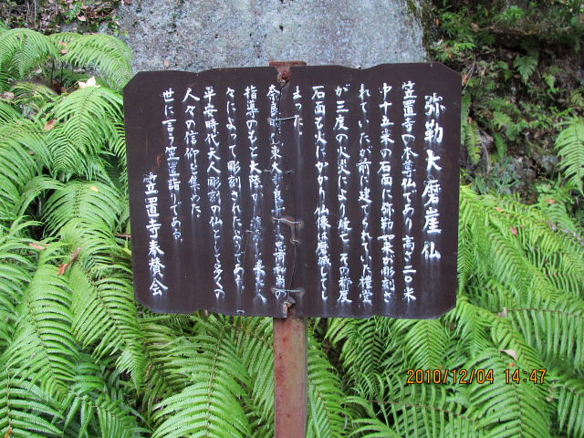 十三重石塔の隣の弥勒石は高さ15m余の巨石で、寺の本尊弥勒菩薩を浮彫にしてあつたが、兵火で焼滅した。その前の本堂は懸崖造。その下の道を進むと虚空蔵石磨崖仏(平安)がある。高さ13m、幅7mの巨岩に線刻されている。