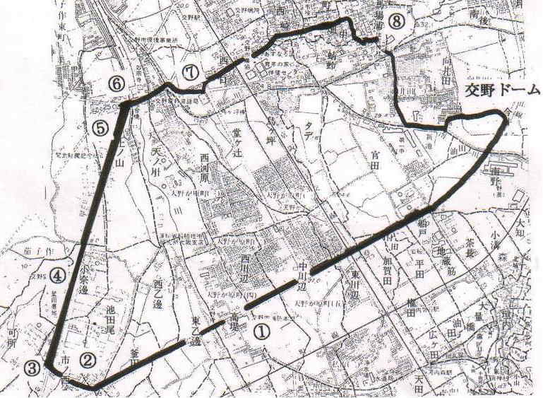 私部の南川と北川とに挟まれた三角地帯で、現在の向井田一丁目と二丁目である。