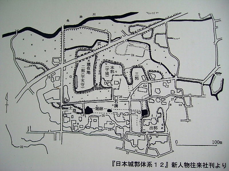 | 二郭の上からみた形は、南北約110m、東西約50mの長方形である。二郭は北側部と南側部は東西に走る道路によって分断されている。 発掘調査の結果、高さ1m以上の盛土痕跡もあり、本郭同様に自然地形を利用しつつ土木工事を施して築城している。郭の上面からは井戸や土坑などの遺構のほか、周囲に瓦が散布している柱穴群も確認されている。二郭南端には本郭同様に平坦面が続き、本郭と繋がる。 |