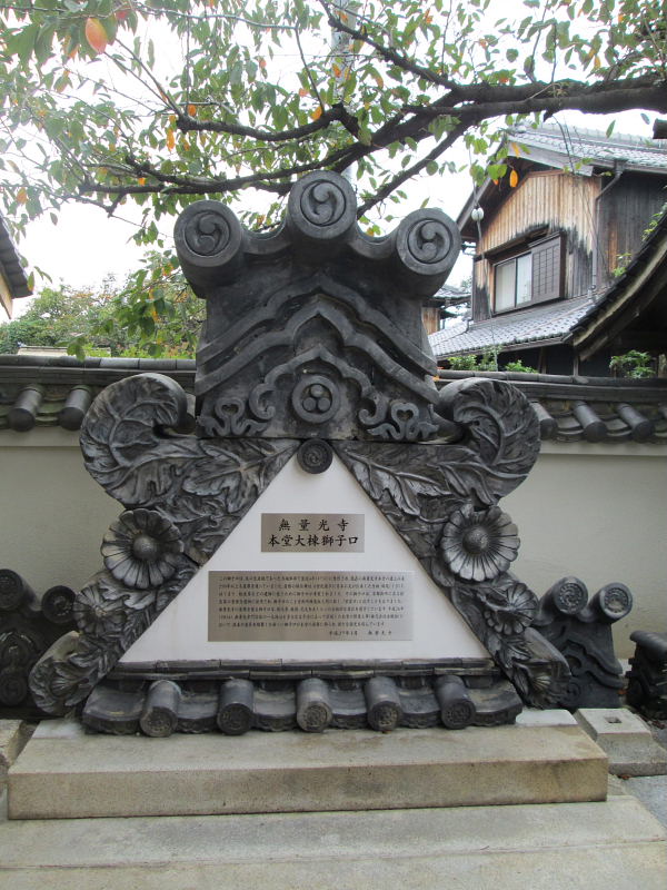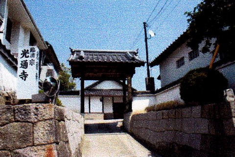 | 無量光寺 宗派は浄土真宗西本願寺 本尊は阿弥陀如来立像 平安時代末頃の作、木造で像高90cm余。 かつては住吉神社の西方に天台宗の尼寺として建立される。しかし嘉吉の乱(嘉吉元年「1441」播磨の領主、赤松満祐(みつすけ)が六代将軍足利義教(よしのり)を殺すという事件をいう)この時この寺に立ち寄った赤松軍を追った足利軍に焼かれたと云われる。明応3年(1494)足利に仕えた星野親忠はその晩年を私部で過ごす為この無量光寺の旧跡を再興し仏門に入った。そして子能末は父の後を継いで僧となり了道と号した。この頃本願寺中興の祖といわれる蓮如がこの地に布教に来られ、当時の僧、了道は教えを受けて、浄土真宗に転じた。 戦国時代、信長の石山本願寺攻め〔1570〜1580〕の時住職の三世覚心は本願寺に味方し、信長方にいた私部城の安見右近と戦った為、寺は焼かれ覚心は追われ20年余り帰れなかったといわれる、私部にやっと帰った覚心は現在の地に土地を求め寺の再建にのりだしたが完成したのはそれから170年余後であったといわれる。 {出展 交野市教育委員会、執筆片山長三氏} |