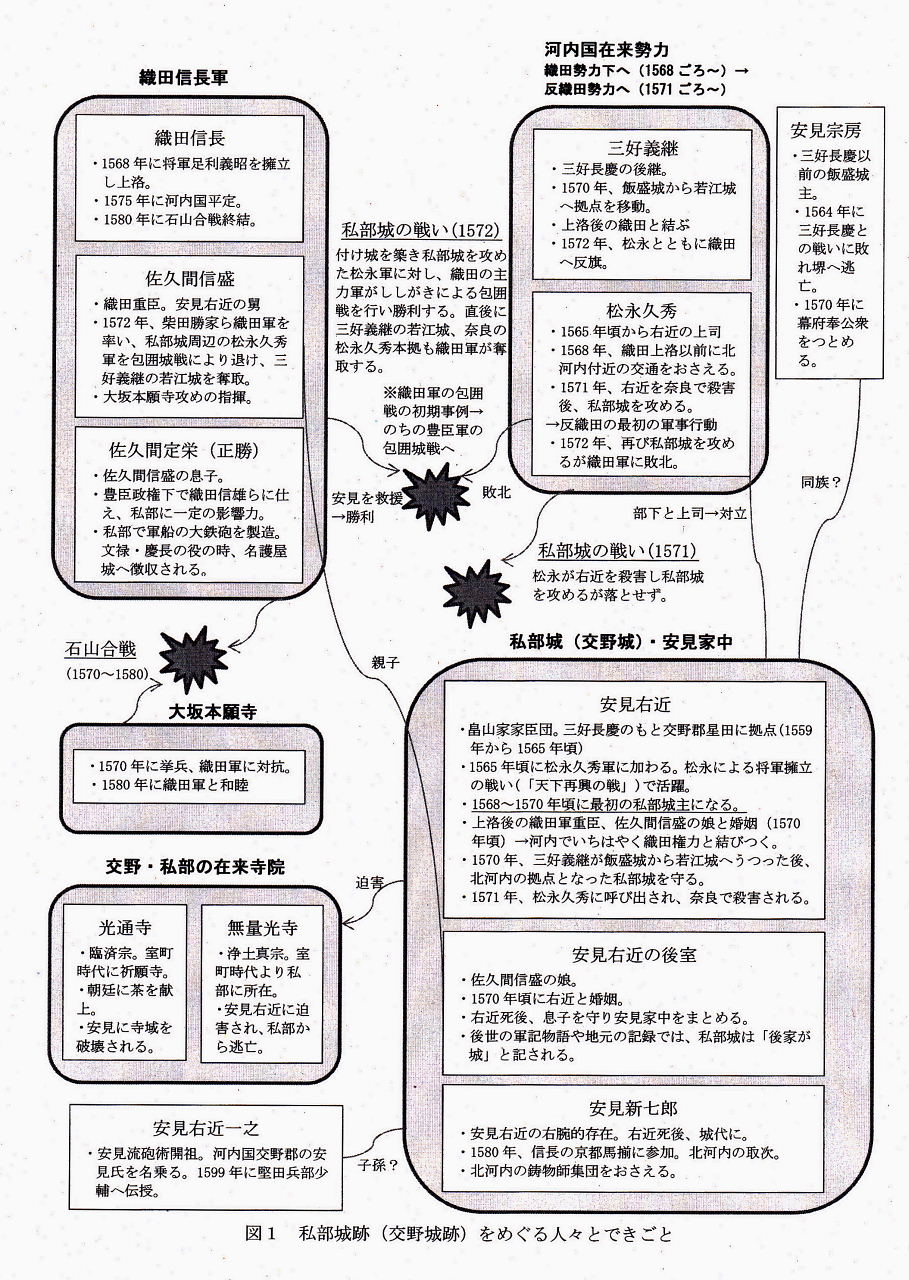 私部城の歴史 私部城は何時頃出来たか? 1568年{永禄11}織田配下となつた安見右近により完成したとみられる 1571年{元亀2}安見右近が奈良多聞城で切腹においこまれる。直後に私部城を攻める。城主不在の危機を乗り越える 1572年{元亀3}4月松永久秀が再び私部城を攻める。この時は織田方の柴田勝家、佐久間信盛等の援軍により撃退 1578年 (天正6)安見新七郎所で信長が休息する 1581年 (天正9)信長の馬揃えに取次者である安見新七郎が召集される。以後消息。 |