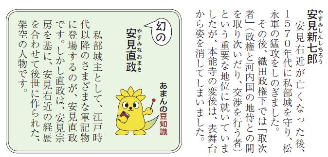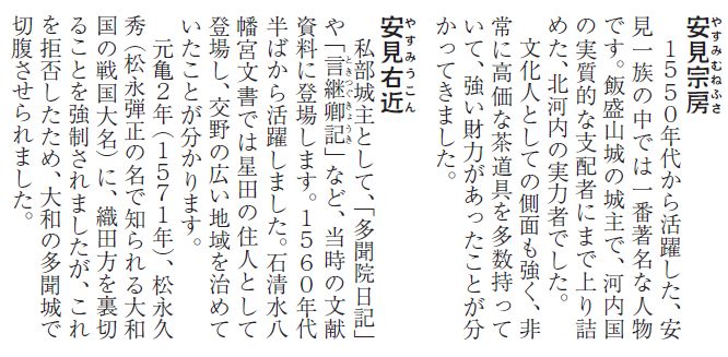 光通寺棟札 光通寺は室町時代から朝廷との深いつながりを持つていましたが、戦国時代になって私部城の敷地に取り込まれ、城の外側に突出して築かれる出郭として利用されたとかんがえられています。 恐らく、この出郭が築かれる時の出来事を指すと考えられる記事が光通寺の寛文4年〔1664〕の棟札に登場します。 「信長配下の安見右近」は義も道もなく法をそこない、光通寺の壁を破り仏閣を地におとした。 破壊を受けた光通寺ですが右近の死から4年後、朝廷女官の記した日記に、例年どうりの茶の記事が見えます。 |