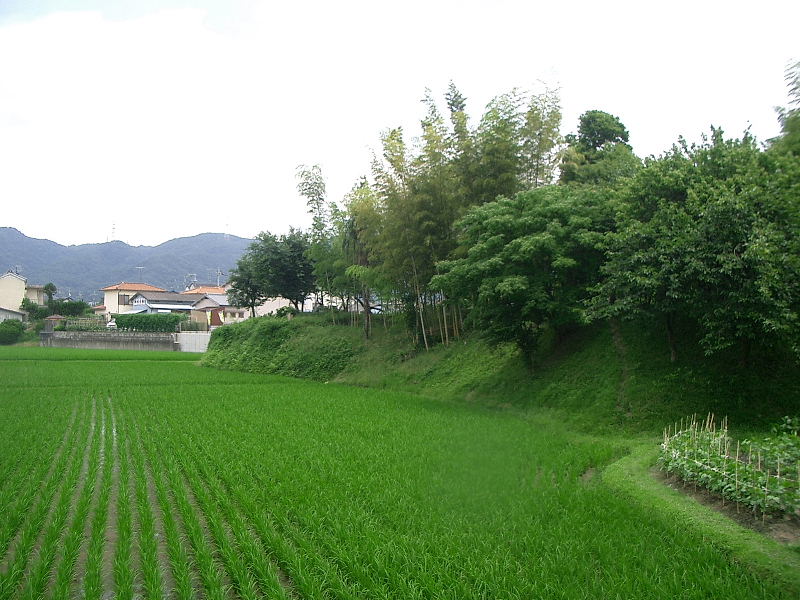 ![]() 右の台地が本郭 東方に交野山が望まれます 本郭の上からみた形は、南北方向を軸とする一辺約60mの正方形である。 築城は起伏のあった自然地形に盛土を行い造成している。 |