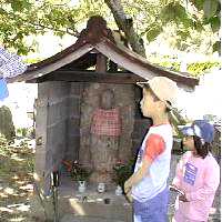 墓地の「迎え仏」の手前にあり、小さいブロックの屋形の中で東面しておられる。右手に与願印を示し錫杖を持っておられない古い形である。錫杖を持つ形式は新しく、藤原時代の終わりごろから作られるようになる。左手には「与願の玉」を持っておられ、この玉はどんなことをお願いしても、この玉からお出し預けるという有難い宝珠である。