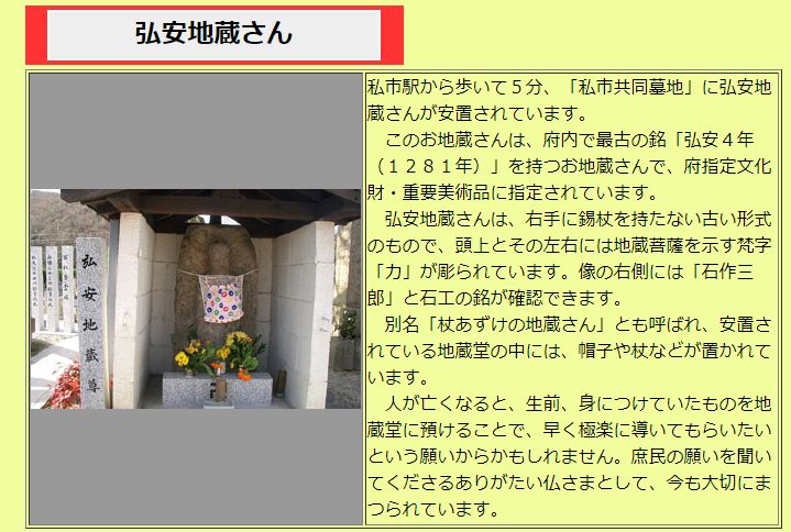 | 「私市共同墓地」に弘安地蔵さんが安置されています。 このお地蔵さんは、府内で最古の銘「弘安4年(1281年)」を持つお地蔵さんで、昭和三十六年十月、大阪府指定文化財・重要美術品に指定されています。 弘安地蔵さんは、右手に錫杖を持たない古い形式のもので、頭上とその左右には「右ハ為二浄林浄雲一石作三郎」「弘安四年四月十五日立之」、地蔵菩薩を示す梵字「カ」が彫られています。像の右側には「石作三郎」と石工の銘が確認できます。 別名「杖あずけの地蔵」さんとも呼ばれていた。生前身につけていたものをこの地蔵にあずけて身軽になってお墓に入る。 人が亡くなると、生前、身につけていたものを地蔵堂に預けることで、早く極楽に導いてもらいたいという願いからかもしれません。 庶民の願いを聞いてくださるありがたい仏さまとして、今も大切にまつられています。 拓本により年代・弘安四年(1281)の年号が読み取れた。それ以後、年号の弘安から「弘安地蔵さん」と呼ばれるようになった。 |
