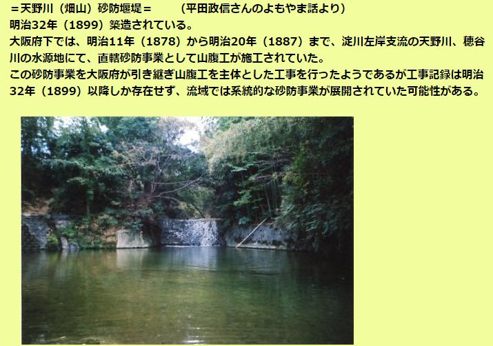 | 国登録有形文化財 (明治時代)@天野川堰堤 1基(石造堰堤、 堤長20m、高さ6m) A尺治川堰堤 1基(石造堰堤、 堤長9.3m、高さ2.2m) B尺治川床固工 1基(石造堰堤、 堤長9m、高さ1.8m) ※オランダ人技師デ・レーケの指導により砂防堰堤が築造された。 |