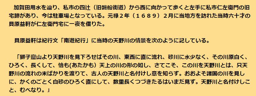 | 貝原益軒(1630−1714) 江戸時代の儒学者であり、博物学者、教育家でもある。福岡藩士の子として生まれ、名を篤信という。生涯を通じ、長崎、江戸、京都などに遊学をし、さまざまな学問を学んだ。 「南遊紀行」から、元緑二年(1689)二月十日朝、京都東洞院の宿を出た益軒は、淀から八幡へ、洞が峠へと東高野街道を田口から郡津へと向かっている。獅子窟と岩船をみるために私市への道をたどり、この日は私市農長・仁左衛門の家に泊まっている。 |