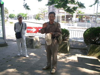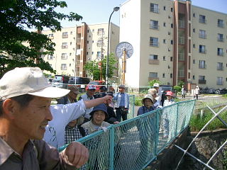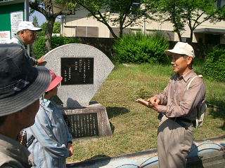 | 郡津駅前の松塚公園にて、中会長より郡津の歴史について説明を受ける |