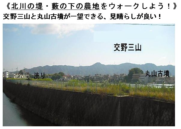 | 古文化同好会の歴史ウォークでも今まで歩いたことのない、藪の下の農道から丸山古墳を一望、遠くの山並み・交野山など交野の長閑な風景を楽しんだ後、東に出て東高野街道に入る。 | ||