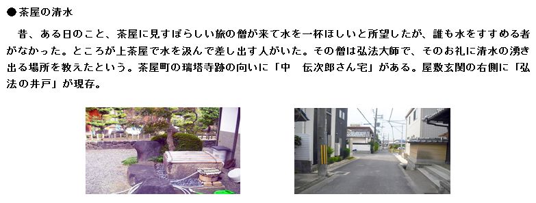 | 昔、ある日のこと、茶屋に見すぼらしい旅の僧が来て水を一杯ほしいと所望したが、誰も水をすすめる者がなかった。ところが上茶屋で水を汲んで差し出す人がいた。 その僧は弘法大師で、そのお礼に清水の湧き出る場所を教えたという。 |