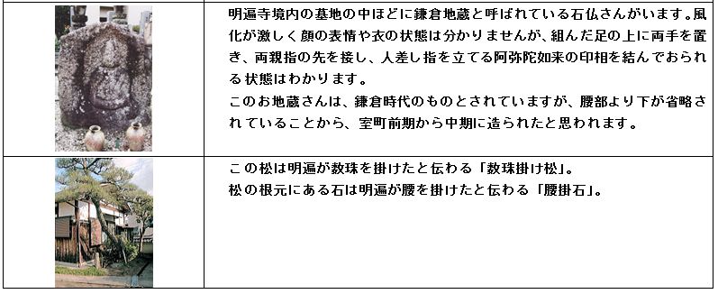 明遍寺(摂取山蓮華三昧院) 交野郷土史かるたには次のように記されている。 「ね」念仏を 教え伝えて 明遍寺 明遍寺は摂取山と号し、源平時代、白河上皇の側近で、学者であった藤原信西が平治の乱(1159年)で源義朝に殺されたが、このとき信西には26人の子があったが、内男子13人は出家して僧になったという。 明遍はそのうちの1人で兄弟の中でも最も優れていたとのことで、治承年間(1177〜81年)高野山蓮華三昧院で修行したが、浄土宗の開祖法然に帰依し、京都と高野山を度々往復するうち当地(交野郡郡門村)に休息のため庵を作り、近在の百姓に念仏信仰を解いたのに始まるという。 寺号はこの明遍より起こるが、その年代は明らかでなく、当初は阿弥陀寺と号したとも伝わる。 |