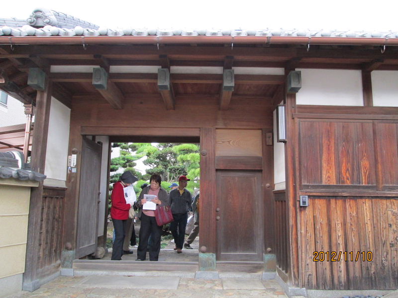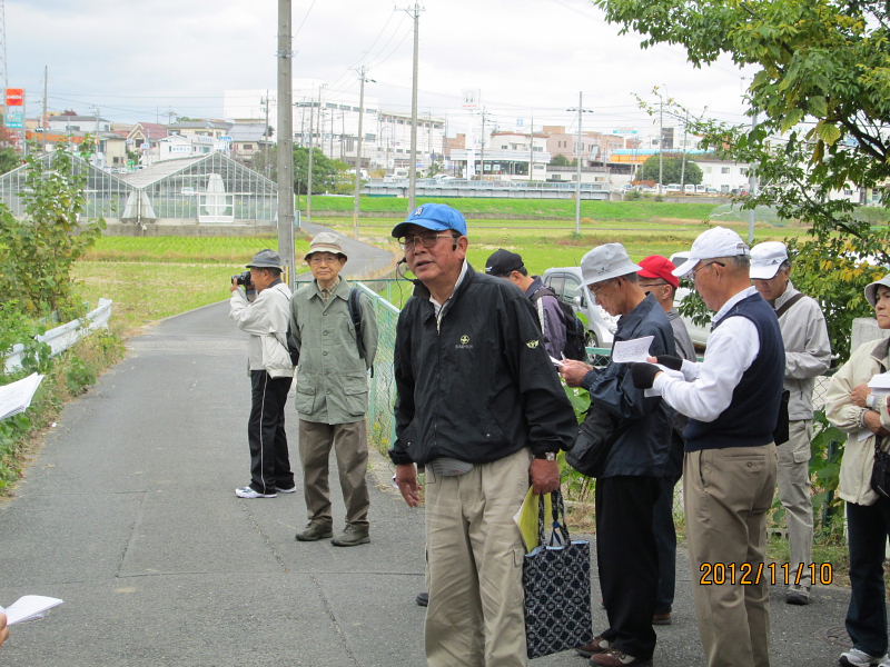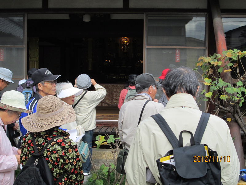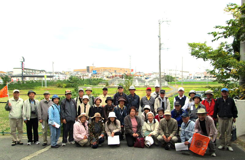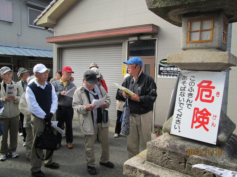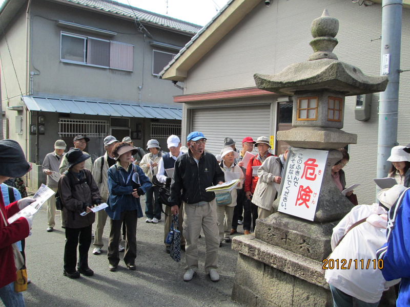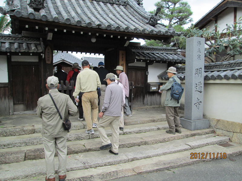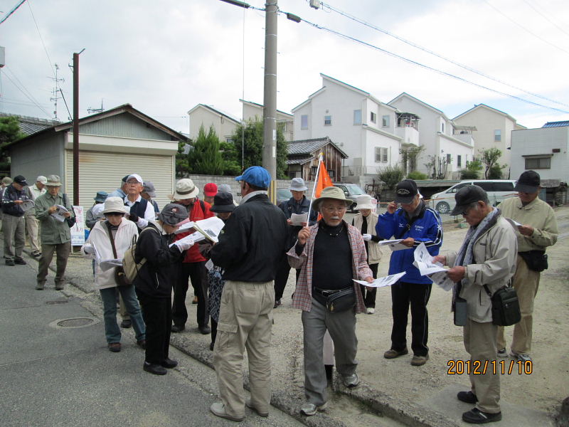 | 2012.11.10(土)午前10時、京阪電車郡津駅前の松塚公園に集合。 定刻前から「広報かたの」で見たのですが一緒に歩けますか?集まるのはここですか?と言いながら新しい顔ぶれの方を含めて沢山の方々に参加いただきました。 村田広報部長の挨拶の後、古文化同好会40周年記念・ふるさと交野を歩くの第6弾「郡津の東高野街道を歩く」をテーマに、松塚の駅前から郡津の町中を歩き明遍寺まで、案内役:黒田幸男企画部長より「郡津の史跡と伝説・寺院めぐり」の解説を聞きながらゆっくりと歩いてきました。本日の元気な参加者は総勢36名(内会員26名)の皆さんでした。 先ず最初に、黒田さんより郡津の歴史と地形などについて、本日の散策行程図と郡津の地名地図などを基に詳しくお話を伺うことが出来ました。郡津駅前付近は、昭和42年ごろ、松塚団地が出来てすっかり様相が変わっているが、北川が天野川に流れ込む手前、山崎の西方は、低湿地帯で長淵(ながぶち)と言われていて、ちょっとした大雨が降ると一面湖水に変わり、京阪電車の線路だけが水面に顔を出している光景がよく見られたそうである。長渕、申田(さるだ)の地名があった。 郡津駅前から歩き、松塚のふれあい館前で「交野の少将」の話を聞き、極楽寺、丸山古墳などを見学。古文化同好会の歴史ウォークでも今まで歩いたことのない、藪の下の農道から丸山古墳を一望、遠くの山並み・交野山など交野の長閑な風景を楽しんだ後、東に出て東高野街道に入る、交野女子学院の裏手付近には、「ものきき」「藪の下」などの地名が残っている。 茶屋の清水の伝説が残る、中伝次郎様宅の「弘法の井戸」を見学、その後中小路集落のT字路、遠見遮断の道路、カギ型道路など集落内をくねくね歩いて、明遍寺へ。境内には僧明遍の数珠掛松や腰掛石があり、古式豊かな鎌倉地蔵や層塔の四方仏、板碑や唐臼地蔵、双体仏、一石五輪など沢山の石仏がある。 郡津駅から東高野街道を通り明遍寺へと歩き、今回もまた新しい歴史に出会うことが出来ました。 案内役の黒田部長、有難う御座いました。 ●郡津とは・・・・郡津と書いて「こうづ」と読む。おこりは郡衙(ぐんが・役所)の門の前からおこったので郡門村。最初は「こうど村」といった。いつのまにか「づ」と呼ばれ、大坂奉行所の命により「郡津」と改めた。(1804年) ●交野郡(ぐん)衙(が)とは・・・・ 古代律令社会で地方の民を統卒するのが郡司、年貢米を徴収する中心地が「郡衙」役所であって米倉が林立していた。 ※高槻の「郡家」・茨木市の「郡山」、「郡家}・寝屋川の「茨田郡家」など同例 ●長渕とは・・・・京阪電車郡津駅から村野駅の線路両側に広がる土地は天野川の川床と同じ高さで低い土地である。一雨降ると線路や畑は水浸し、いつまでも水がひかなかった。山崎橋手前の村の住宅の所に「長渕池」が有った。線路脇の用水路は水はけ用として人工で掘られ北川から天の川に注ぐ。 ※当日頂いたレジメは、史跡・伝説の解説編と資料編の2編に亘り、詳細に纏められた素晴らしい内容で、黒田さんより快く提供を受けましたこと、誠に有難うございました。 記して謝意を申しあげます。 |