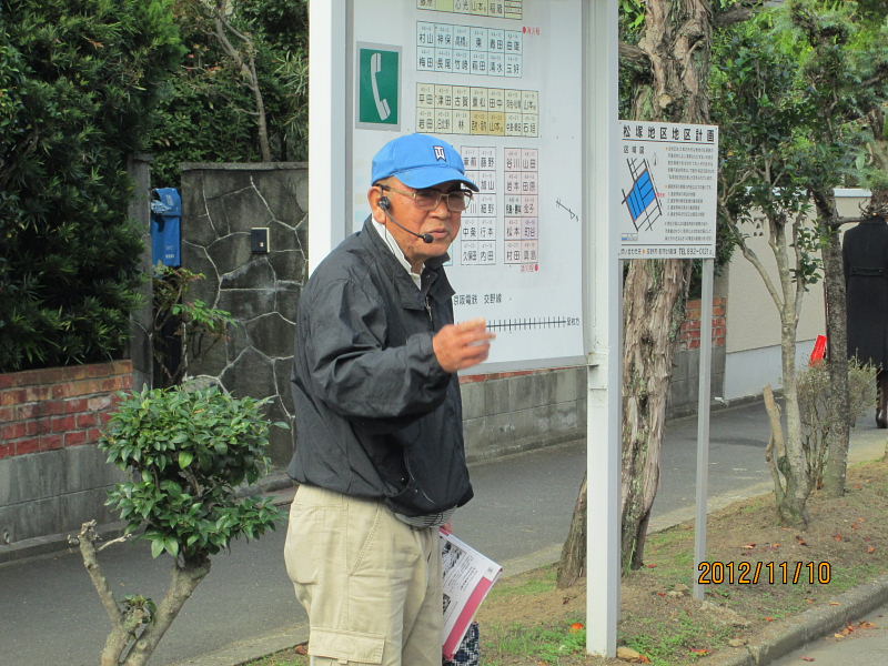 ![]() 黒田幸男企画部長より、郡津の歴史と地形などについて、 本日の散策行程図と郡津の地名地図などを基に詳しくお話を伺った。 |