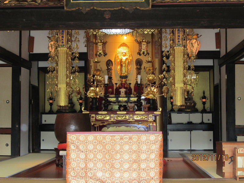 | 本尊:阿弥陀如来立像、室町時代。来迎印、寄木造り。像高:59 cm。 脇侍像:観音像、37.2 cm。勢至像、37.3 cm。江戸時代。 |