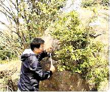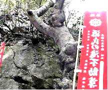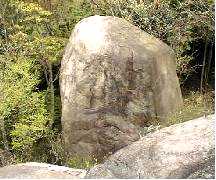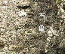 15分ばかり歩いて先ず、三宝荒神さんの梵字の仏にお参りし、平田さんが長い間探し求めて苦労の末にやっと見つけられたという、石亀さんにお会いできた。それは荒神さんの前の大きな岩に確かに「石亀」と彫られていた。探し当てた時、夢にまで見た恋人に会えた時のように感激も一入だったろう。