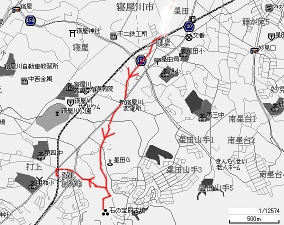 | 行程; JR星田駅 午前9時→寝屋・大谷→南大谷大師像→弘法井戸→明光寺→高良神社→ 石の宝殿→打上の道標→JR東寝屋川 午前11時過ぎ解散 徒歩約 3km |
