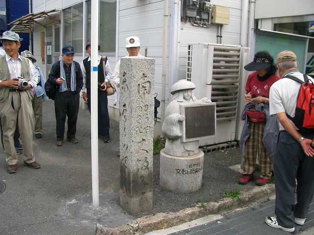 | 200710.13(土)午前9時、JR星田駅前に集合。天候、晴れ。 いつもの元気なメンバー15名の参加で、星田駅前から大谷から打上を経て、東高野街道周辺の史跡を巡りながら元気に歩いてきました。 星田駅前にて、案内役の中光司会長より当日の行程など挨拶があり、早速駅前を出発。東高野街道の昔の面影が残る大谷の住宅街を南へ、先ず大谷橋の傍の大谷北大師祠に参拝、更にゆっくりと大谷町の史跡を廻りながら南下、寝屋川変電所前で府道を渡り、新しい住宅地の中に消えてしまった旧道を探りながらゆっくりと田圃道を歩き、山根街道との合流点にある、大谷南大師祠に到着。ここで、星田の村から続く山根街道を北へ辿り、田圃道をぐるりと回って、「妙見道・大坂道」の道標を確認した。畦道を歩き再度、東高野街道に出て、打上の弘法の井戸、明光寺、高良神社、石の宝殿を見学。丁度、当日は打上地区の秋祭りで、奇麗に提灯などで飾られた立派な山車の前で、全員元気に記念撮影。最後は、打上の四辻に出て、道標など確認して、東寝屋川駅で解散。さわやかな秋空の中、皆さんお疲れ様でした。 今回も新発見の歴史に出会うことが出来ました。 講師の中会長、有難う御座いました。 次回は、11月17日(土)、第86回歴史健康ウォーク「安土城」を散策します。 集合は、午前9時、京阪枚方市駅(京都方面ホーム中央) |