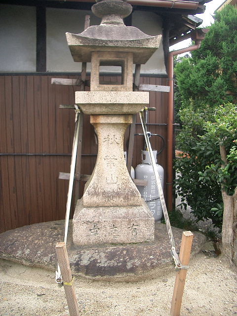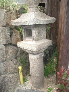![]() 道標と道を挟んで一基の灯籠が立っています。 文字は「秋葉山」とあります。夜に灯明を上げて 四辻を照らしたものです。 |