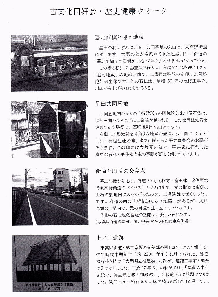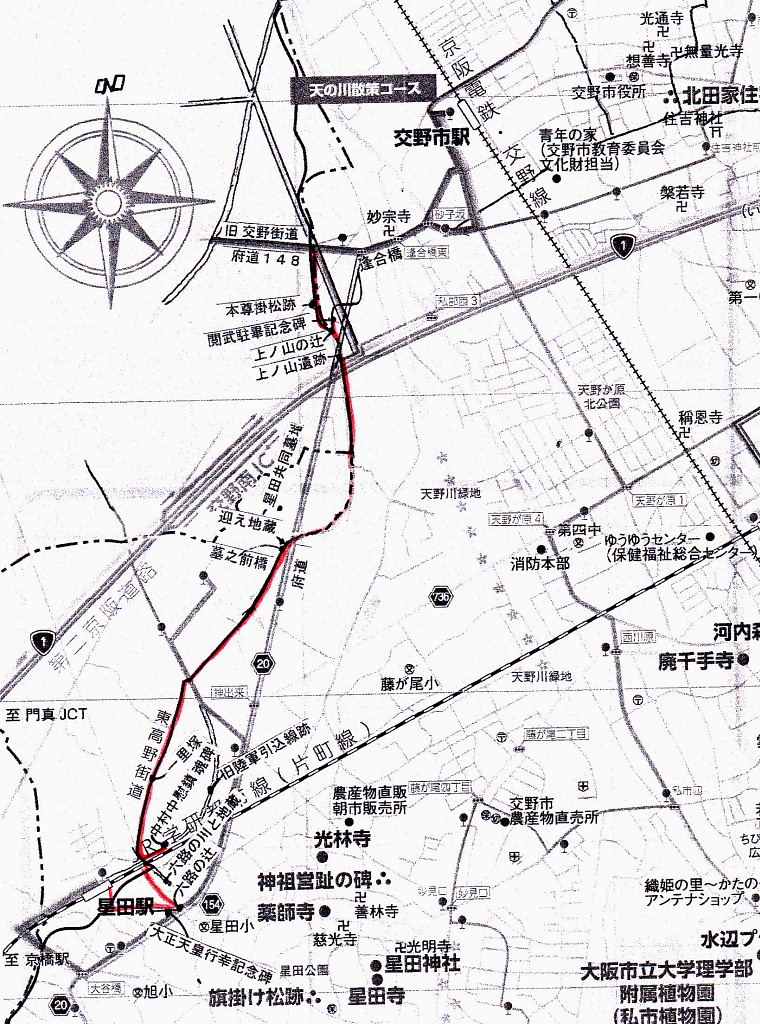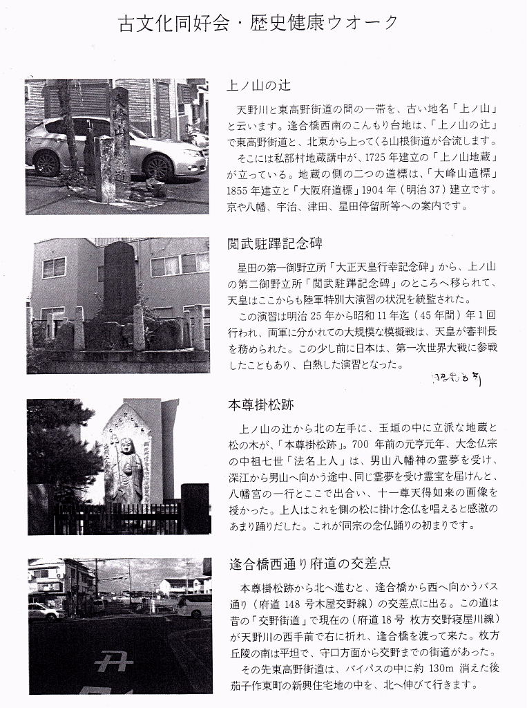 | 天野川と東高野街道の間の一帯を、古い地名「上ノ山」と云います。逢合橋西南のこんもり台地は、「上ノ山の辻」で東高野街道と、北東から上ってくる山根街道が合流します。そこには私部村地蔵講中が、1725年建立の「上ノ山地蔵」が立っている。地蔵の側の二つの道標は、「大峰山道標」1855年建立と「大阪府道標」1904年(明治37)建立です。京や八幡、宇治、津田、星田停留所等への案内です。 | ||||||||||||