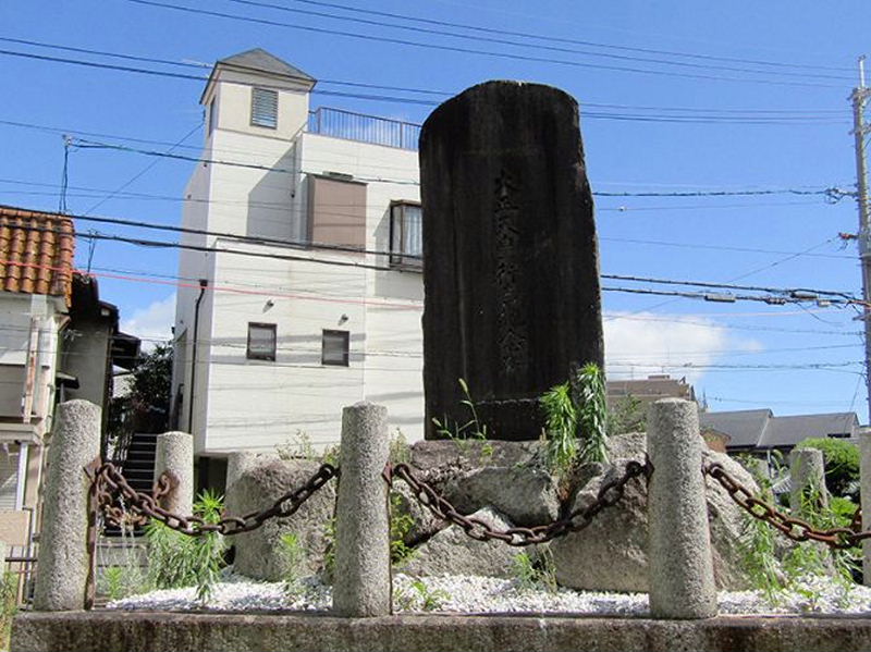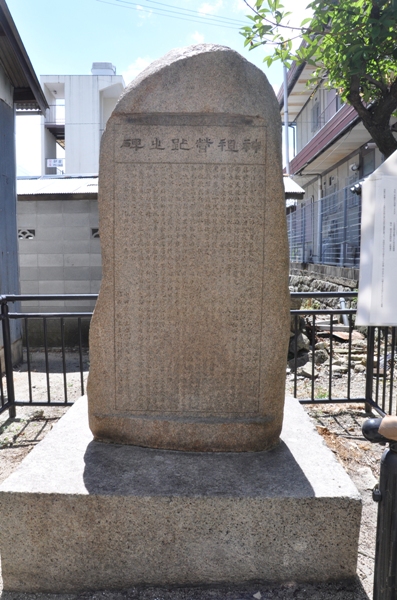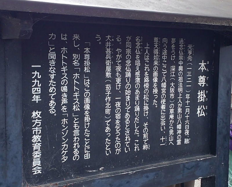 | 元亨(げんこう)元年(1321)11月16日夜、融通念仏宗(ゆうずうねんぶつしゅう)中興の祖法明(ほうみょう)上人が男山八幡神の霊夢をうけ、深江(大阪市)の草庵から男山へ向う途中ここで八幡宮の使者に出会い、11面尊天得如来(じゅういっそんてんとくにょらい)の画像を授かった。上人はこれを路傍の松に掛け、その前で称名念仏(しょうみょうねんぶつ)を唱え感激のあまり踊りだした。これが同宗の念仏踊りの始まりであるとされている。やがて一夜の宿を乞うたのが犬井甚衛門(いぬいじんえもん)屋敷(茄子作北町)であったという。「本尊掛松」はこの画像を掛けたことに由来し、別名「ホトトギス松」とも言われるのは、ホトトギスの鳴き声を「ホンゾンカケタカ」と聞きなすためである。 1994年 枚方市教育委員会 |