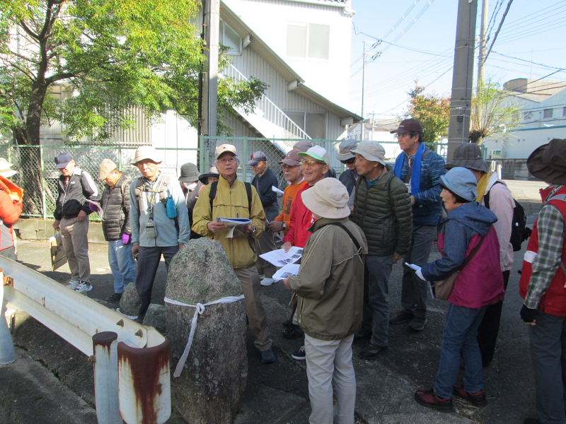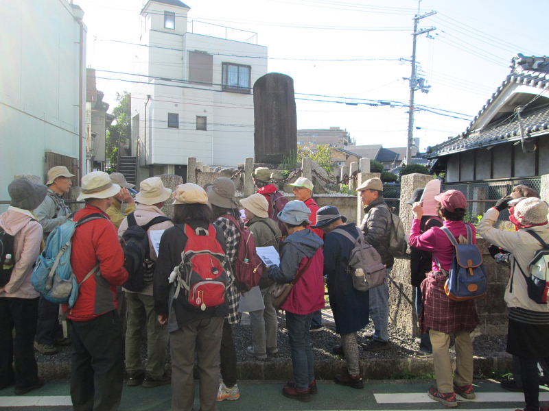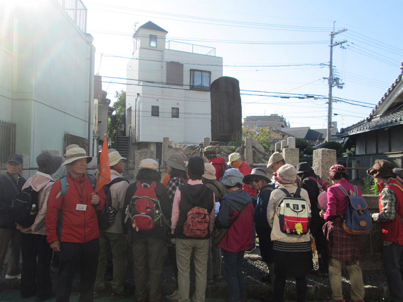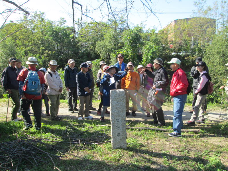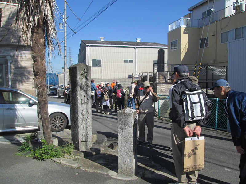 逢合橋を渡りまっすぐ「逢合橋西」の表示板の方向に歩いて、100㍍ほど行くと南北の道と十字に交わる。その道が東高野街道で交野市と枚方市の境である。 この道を左にとり、水道道を越すと、すぐ右に「本尊掛松遺跡大念仏寺」の道標があったが、今は南の玉垣の前に移動している。 ここは、枚方市茄子作4丁目。 ![]() ※茄子作(なすづくり)の地名の由来 平安時代、交野ヶ原で鷹狩をしていた惟喬親王(これたかしんのう)がかわいがっている鷹を森の茂みのなかに見失うと言うハプニングがあった。そこで鷹の足につける名鈴(なすず)を作るよう村人に命じ、この地を名鈴作村(なすずつくりむら)と名付けた故事に由来する。 南に進むと右に、玉垣があり地蔵様がおられる。ここは、上人松の伝説がある。明治30年ごろまで四方に枝を張った松があったが、今はその松はない。二代目と思しき松が玉垣の中に植えられている。 すこし上ると、「うえん山」の辻に出る。ここは山根街道の分岐点で、高さ2mを越す安政2年の道標がある。他に享保の地蔵があり、大阪府の小さい道標に「右 山根街道 左 すぐ東高野道」と彫ってある。歴史上の名だたる人々が往来し、真言密教の道であるとともに、文化を伝え、産業を興した大切な道である。 |