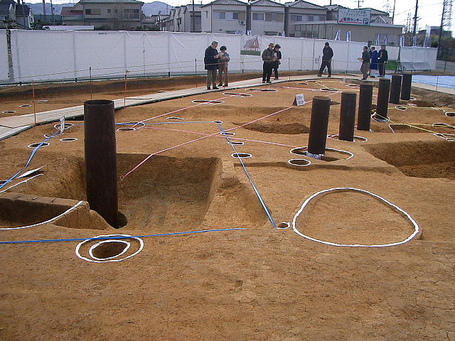 | 弥生時代中期前半〔約2200年前)に建てられたもので平成17年3月の読売新聞では集落の中心施設で「弥生最古級の神殿跡?」と報道され話題になりました。その外、須恵器の大甕を据えた水場、馬蹄形かまど跡、弥生人の指跡が明瞭に残る土器、モミを押し付けた痕の残る土器、須恵器の窯あとではないかと思われる焼けた土痕などが検出されました。 | ||||||||||||||||||||||||||||||||