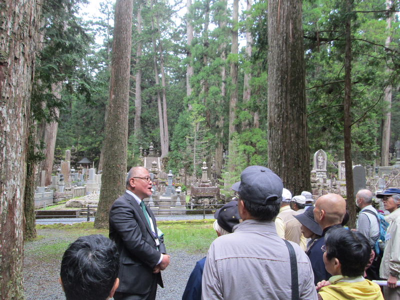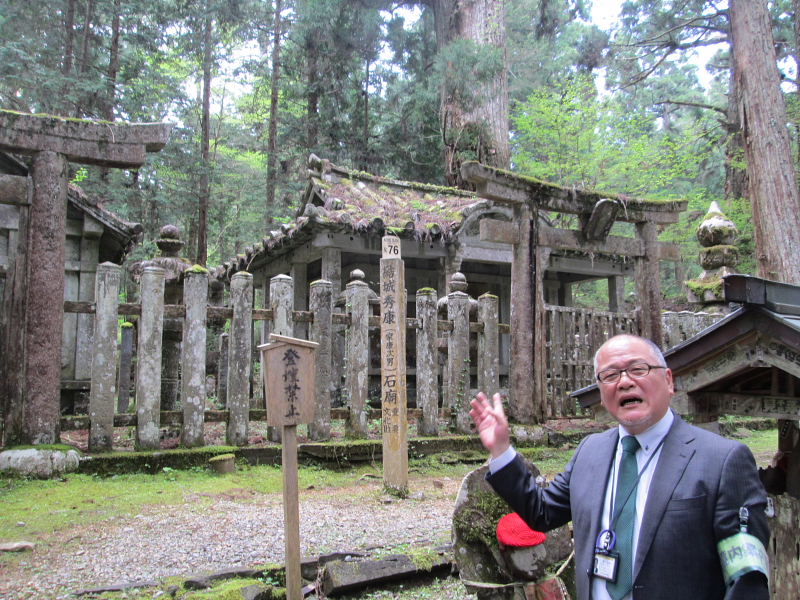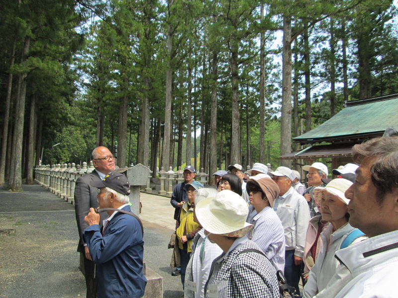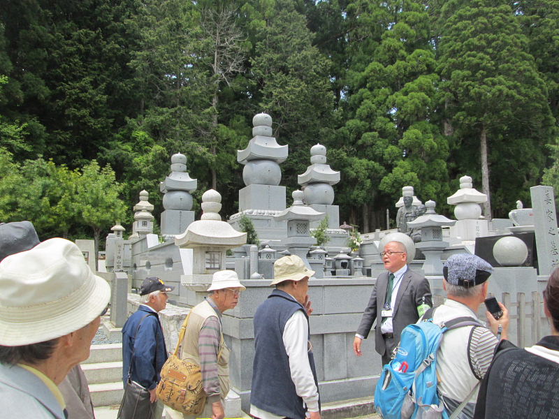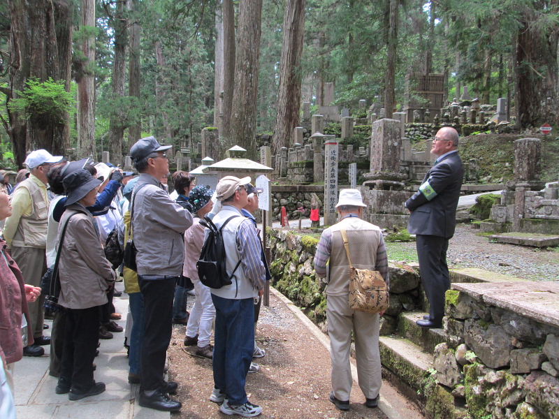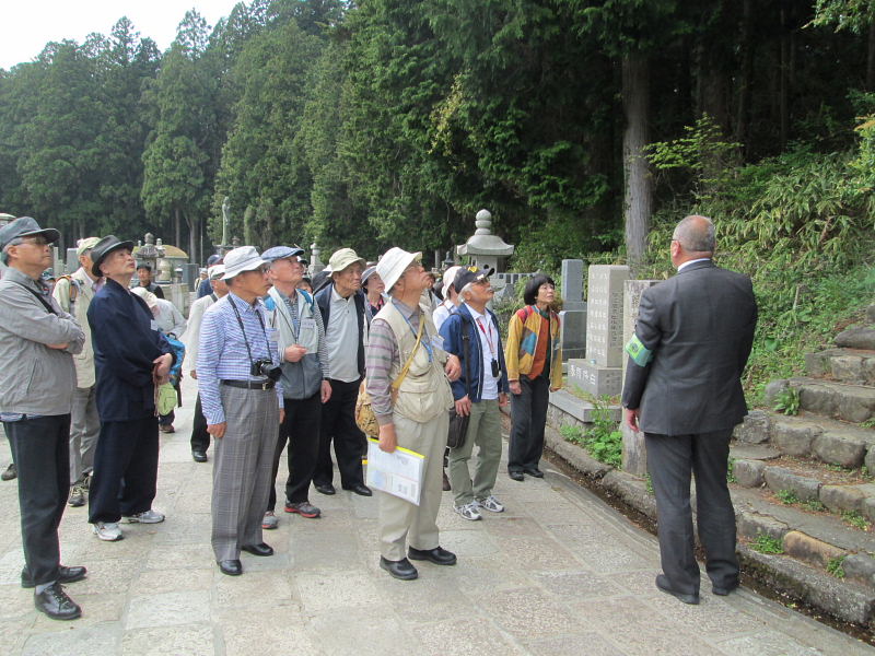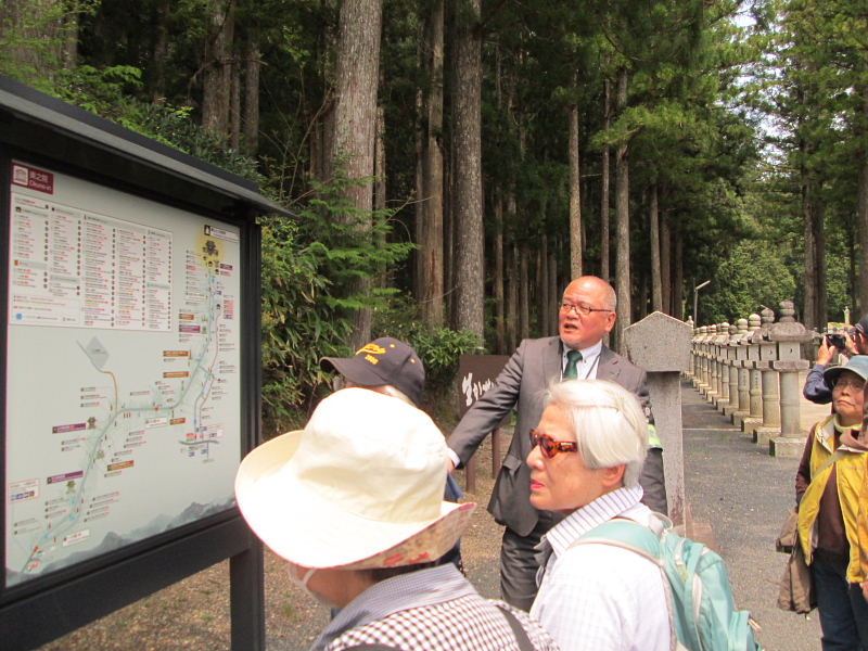 ![]() 高野山公認ガイドの林さん 大きな声で分かりやすくテキパキと案内していただきました! 先ずは、中の橋駐車場から奥の院・弘法大師御廟まで詳しく案内頂きました。 |