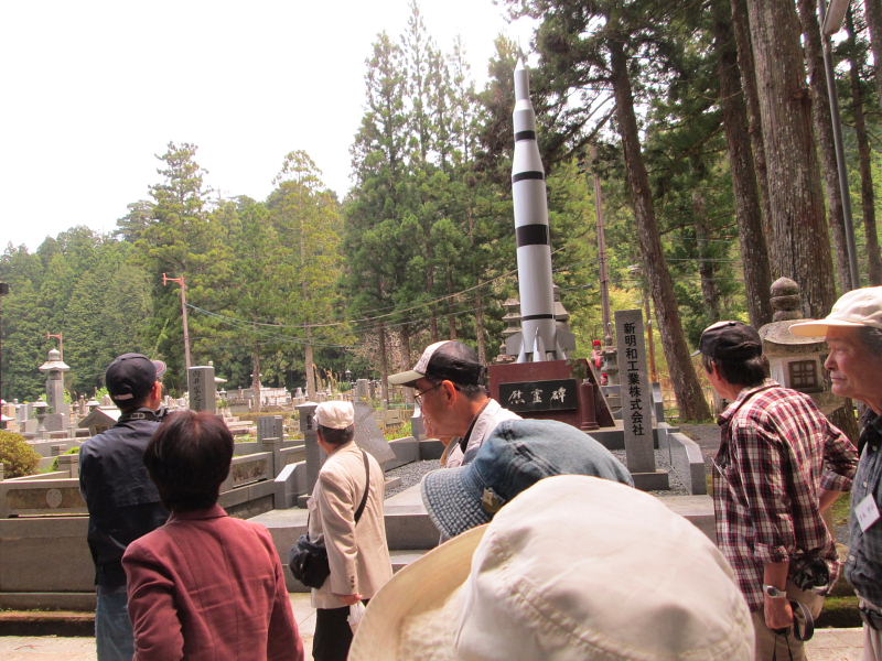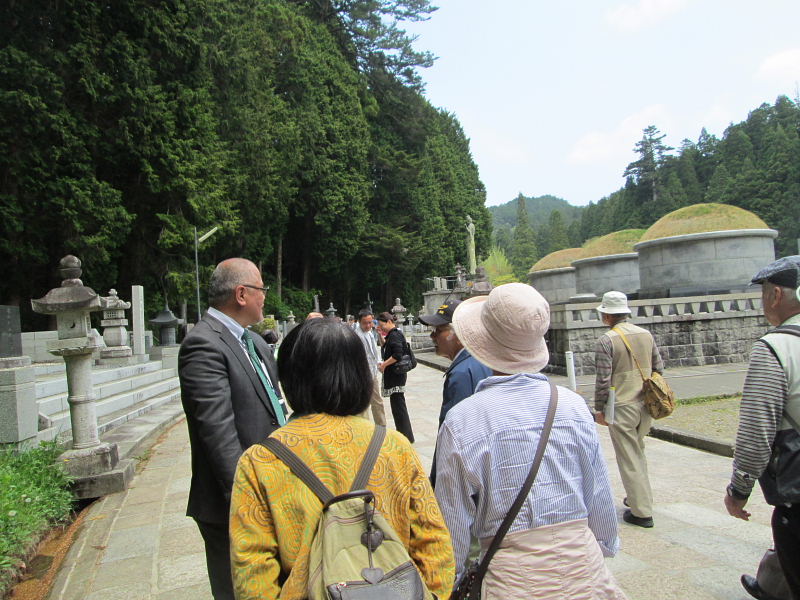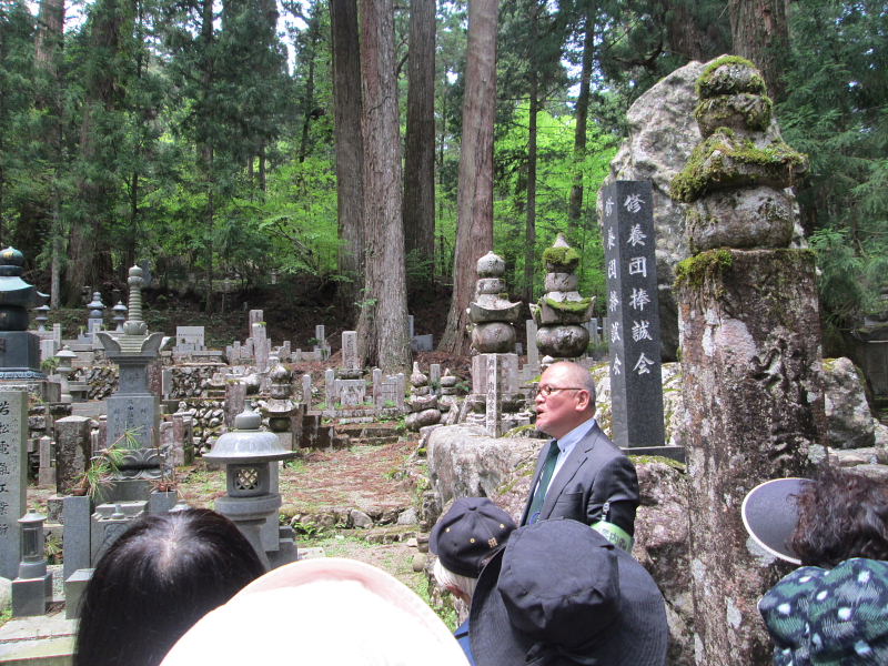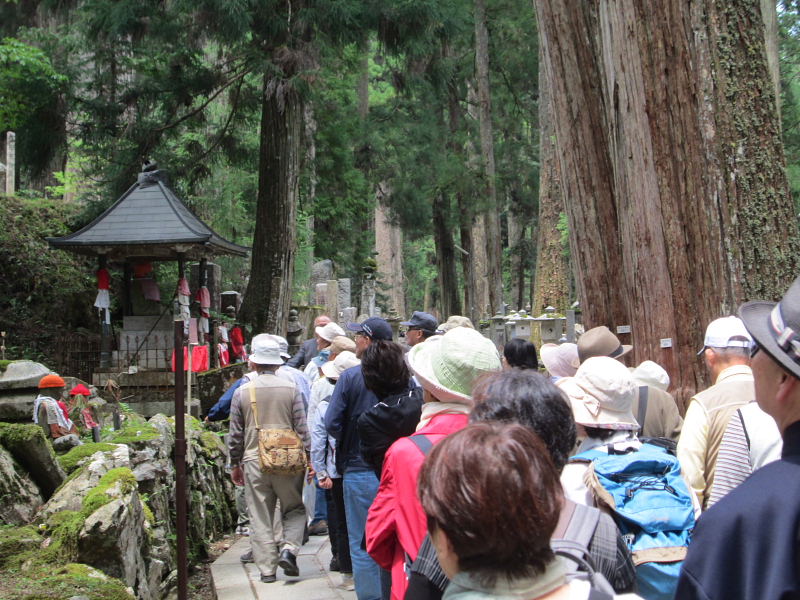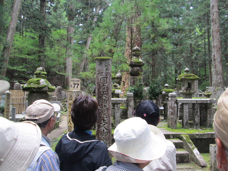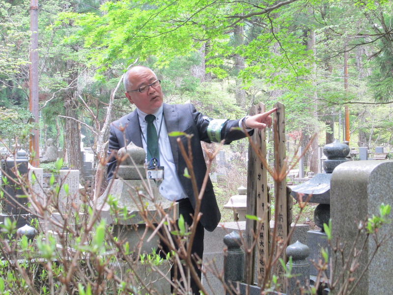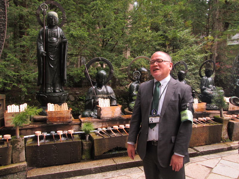 ![]() 高野山公認ガイドの林さん 大きな声で分かりやすくテキパキと案内していただきました! 先ずは、中の橋駐車場から奥の院・弘法大師御廟まで詳しく案内頂きました。 |