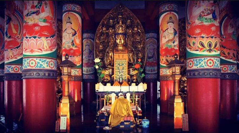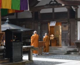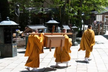 | 生身供(しょうじんぐ) 今も瞑想を続ける空海のために、1200年ものあいだ毎日、食事が作られています。 食事が運ばれるのは、午前6時と午前10時半の1日2回。 午後に食事がないのは瞑想に集中するためだそうです。 生身供(しょうじんぐ)と呼ばれるこの儀式は、嘗試地蔵(あじみじぞう)からはじまります。 毒味がおわったあと、食事の入った木箱は燈籠堂へと運ばれ、肖像画が飾られている前に置かれます。 そして、長い読経が始まります。 食事を運ぶ2人の僧の前にいるのが維那(いな)と呼ばれる僧。 年に1度の弘法大師の衣替えも担当しているそうです。 NHK BS「新日本風土記」で献立の一部が紹介されました。 精進料理ではあるものの、チンジャオロース、きのこのポン酢和え、きゅうりの酢物、クリームスパ、コロッケ、ゆで茄子梅肉和え、きのこ炒め、コロッケ、精進カツ、オレンジ、ドラゴンフルーツなど、和食以外の料理も作られているそうです。 |