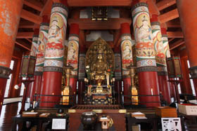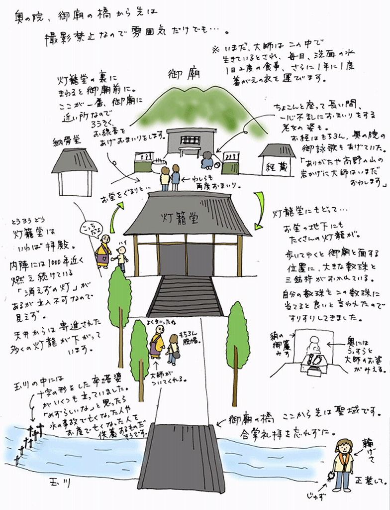| 御廟橋から燈籠堂の間にあるのは…… ・春日局の供養塔 徳川家光の乳母。非公開。 ・歴代天皇陵(後歴代仙陵) 非公開。 ・弥勒石(みろくいし) 善人には軽く悪人には重く感じられる石。自由に触れますが、まず持ち上がりません。 燈籠堂(灯篭堂) 石段を登った先にあるのは「燈籠堂」という大きな建物。 空海の甥が建立。その後、藤原道長によって現在の大きさになったとのこと。 現在の建物は1965年(昭和40年)に建造。 燈籠堂には奉納された2万以上の灯篭があります。 お札、お守りなどは、ここで買うことができます。 燈籠堂の地下には、奉納された5万体もの小さな弘法大師像が並んでいます。 御廟(弘法大師御廟) 燈籠堂の裏手に「弘法大師御廟」があります。 御廟の中に入ることはできませんので、その前で多くの人がお祈りをしています。 弘法大師は、御廟の地下で今も瞑想を続けています。 御廟に30センチほどの穴があり、そこから弘法大師が出たり入ったりしているとのこと。 また、燈籠堂の地下に弘法大師が描かれた絵が掲げられていますが、この絵の位置が、弘法大師が瞑想している高さと同じ高さだそうです。 |