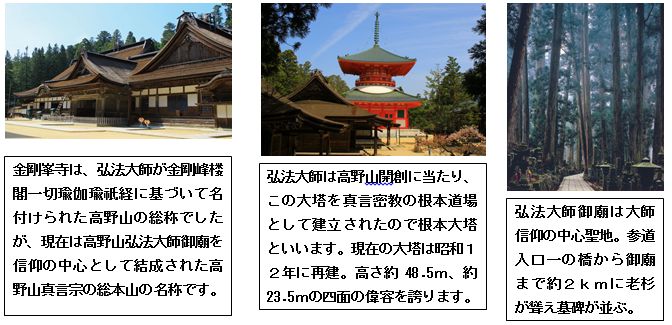 | 高野山は、およそ1200年前に、弘法大師によって開かれた、真言密教の修行道場であり、全国に広がる高野山真言宗の総本山です。 標高およそ900m。山の上の盆地に、壇上伽藍と称する聖地があります。そこには、さまざまなお堂や塔が立ち並び、仏像や曼荼羅が参拝者を迎えます。また、うっそうと老杉の茂る奥之院には、二十万基を超えるあらゆる時代の、あらゆる階層の人々のお墓が立ち並んでいます。 平安初期の真言密教の開祖空海が京都と高野山に本拠を置いて以来、京都の東寺と高野山を直結する東高野街道は、民間の大師信仰、高野聖の活動と相まって、多くの信仰者の往来で大いに賑わいました。 |