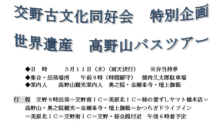 | ◆日 時 5月11日(木)(雨天決行) ※弁当持参 ◆募集人員 50名(定員に達し次第締め切り) ◆参加費 会員 4,500円 一般 5,000円(当日徴収します) ◆集合・出発場所 午前9時(時間厳守) 焼肉久太郎駐車場 ◆案内人 高野山観光案内人 奥之院・金剛峯寺・壇上伽藍 |