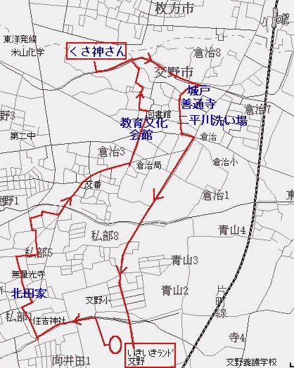 今回は中角氏に講師をお願いし、倉治の町並み及び「くさ神さん」を訪ねて歩きました。 ドーム→住吉神社(狛犬のチンチンを確認)→代官屋敷→札の辻橋→遠見遮断の道(山根道)→倉治・卵塔(現在は住宅地)→大仏坂→教育文化会館→廃円光寺跡(倉治6−2−27)→春日との喧嘩唄→くさ神さん(春日の小篠さんが守っていただいております)→木戸→倉治の子守り唄→二平川の洗濯場→久御山線→ドーム