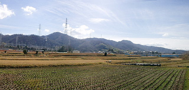 | 交野ドームから府道久御山線を渡り、田圃道を寺の村に向かって歩くと、直ぐに十字路に出合いますが、ここが辻合(つじあい)と言います。 右の写真は、辻合から龍王山を撮ったもの。 昔、寺地区は、JR学研都市線の西側、交野高校の北側の「いまい」という小字にあったという。 「昔、寺村は「いまい」にあってな、水が出て困り抜いたすえ、こんなところには、いまい、いまいといって今の寺村に移ったんや」と平田さんより、村の古老の話を紹介された。 また、竜王山の麓から流れ出た北川の湧水が流れ込む、一段と低い地を冷田(ひえだ)という。 |