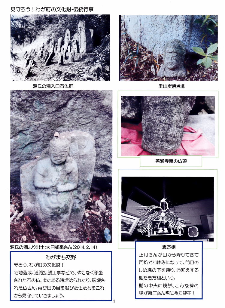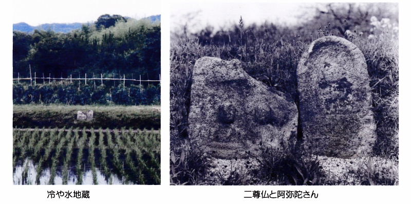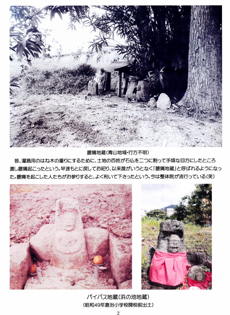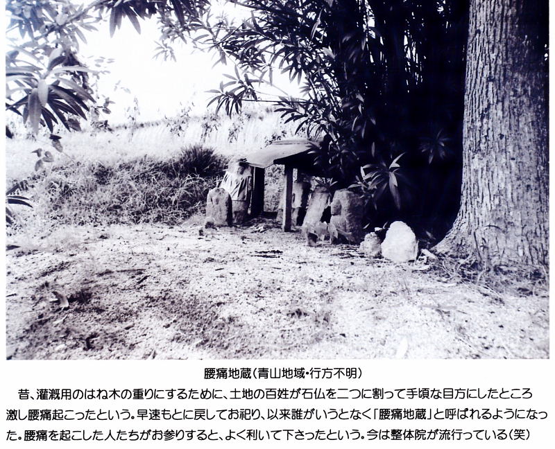 | 腰痛地蔵(青山地域・行方不明) 昔、灌漑用のはね木の重りにするために、土地の百姓が石仏を二つに割って手頃な目方にしたところ激しい腰痛が起こったという。早速もとに戻してお祀り、以来誰がいうとな<「腰痛地蔵」と呼ばれるようになった。腰痛を起こした人たちがお参りすると、よ<利いて下さつたという。 上の写真には、5体の石仏と右に二つの石仏らしき石が写っていますが、5体のうち左から3番目の割れた阿弥陀様が「腰痛地蔵」である。 こんな風情のある風景も近年住宅開発が進むにつれて見ることが出来なくなっている。大変貴重な写真です。 |