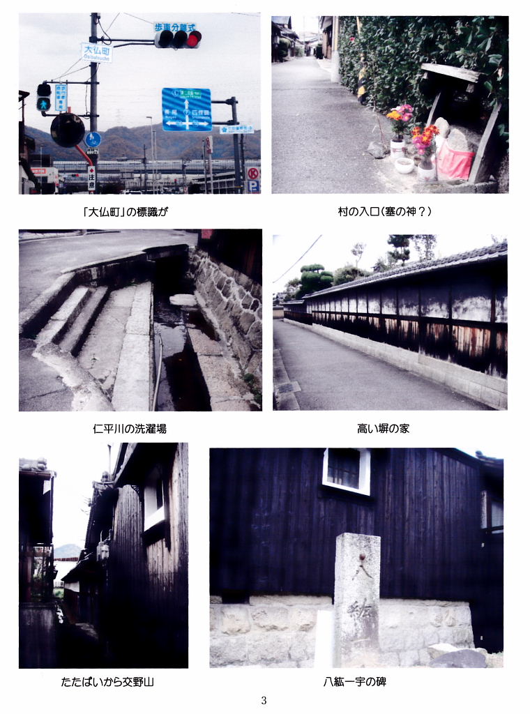 | 府道久御山線沿いの浜の池地蔵(バイパス地蔵)にお参りする。交野山を背に良いお顔をしておられる。ホッとする風景であるが、普段の生活の中では中々目に止まらない地蔵さんである。 普段あまり歩くことのない倉治の集落への入り口付近に、「賽ノ神」が祀られている。北へ行ったところに「仁平川の洗濯場」。 ここの四辻に立って見える風景はいい。小川が流れ、石垣に板壁、白壁の家と昔懐かしい家並みである。少し歩くと、へっついさん(台所)の煙出しを備えた大屋根の家、茅葺の家、どっしりとした門構えなど、素晴らしい家々が並ぶ。 「光明院」付近の四辻からは、前が見通せない。昔、ここに泥棒が入ったが、村から出るに出られず捕まったとか。 |
