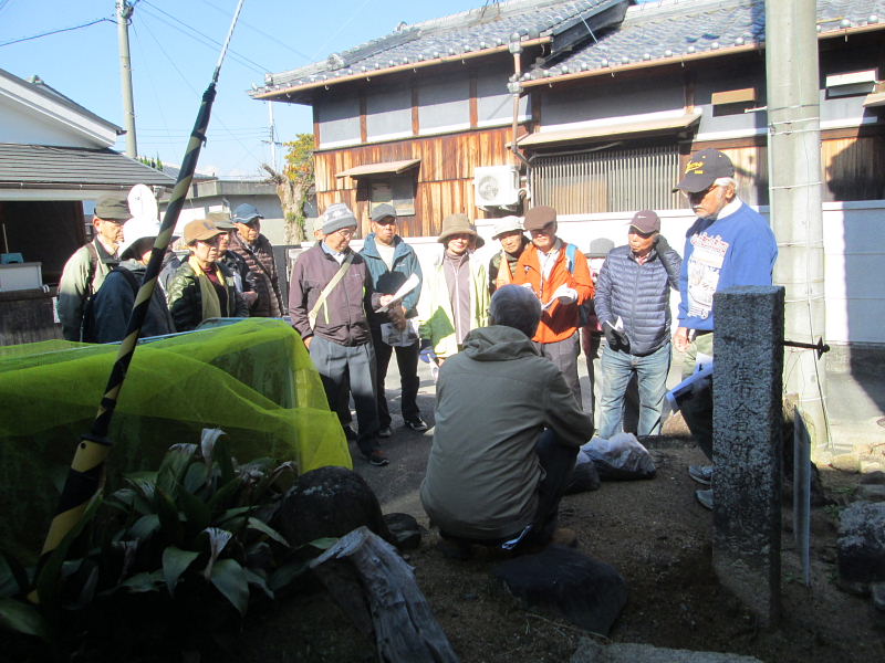 | 最初に案内されたのは、久御山線をわたり私部墓地へと続く昔の野辺送りの道・南後(南郷)を通って、青山の田圃道にひっそりと祀られている「冷や水地蔵」だった。こんなところにも地藏さんが居られると、皆さん感心しきり。また、この近くに祀られていたが、第二京阪国道の工事中にどこかえ消えてしまった、「沈黙地蔵」について、当時の状況など詳しく説明を受ける。 | |||||||||||||||||||