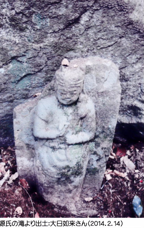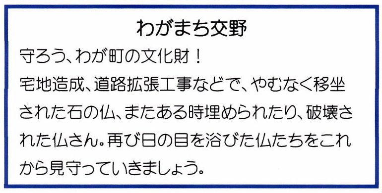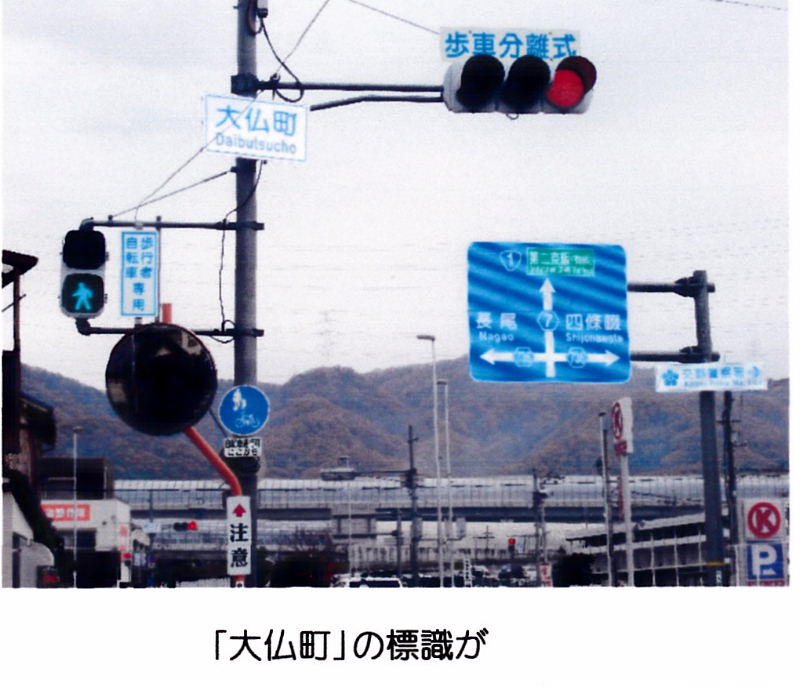 | 倉治の教育文化会館前の道を南にとるとすぐ四辻に出る。下を倉治中川が流れている。この角を「どう前」と呼んでいる。ここを過ぎて、なお南へ行くと信号のついた四辻に出る。ここに京阪バスの「大仏町」のバス停がある。この交差点を南へ渡るとだらだらと下り坂になっている。この下り坂を「大仏坂」と呼んでいる。 この地は、奈良の大仏建立に関わる歴史を伝えているのではないかと、故奥野平次氏は「ふるさと交野を歩く・ひろい話」の中で次のように書かれている。 大仏様の大体の形が出来て、鋳型に銅を流し込もうとしたが、どうも上手くいかない。東大寺では困って、宇佐八幡宮の付近にいる技術者(渡来人)に来てもらった。その技術者のターミナルとなった所が、枚方市、中宮の百済寺と、私市の獅子窟寺である。 どちらからも、交野市の傍示に上り、生駒市の傍示に通じる「大仏の道」を通って、東大寺に急いだのでした。奈良で大仏の仕事を終えた技術者がここの地区で鋳型に銅を流し込んだ仏様を作ったのでは、または、その技術者が住み着いたので大仏の地名がついたのではないかと。 |