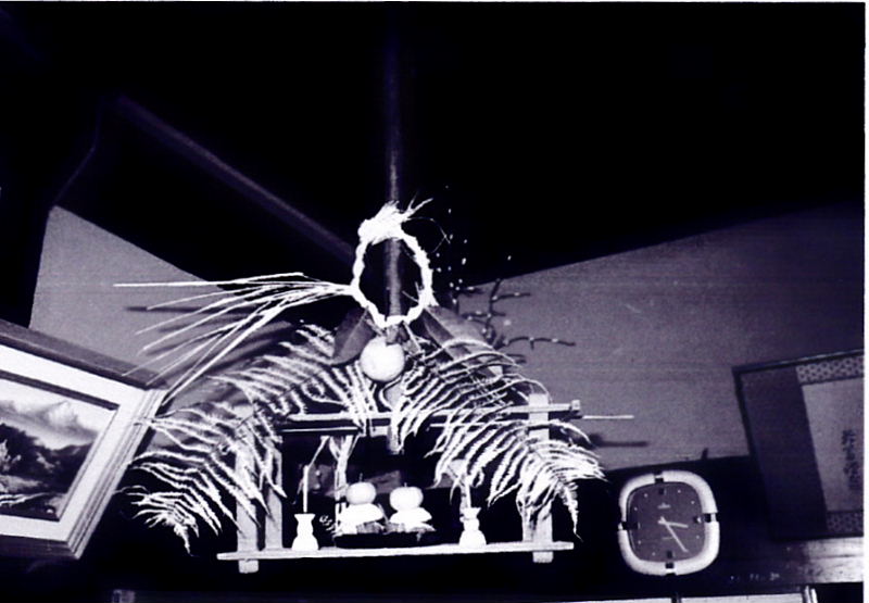 ![]() 恵方棚 正月さんが出から降りてきて門松でお休みになつて、門□のしめ縄の下を通り、 お迎えする棚を恵方棚という。 棚の中央に鏡餅、こんな神の場が新庄さん宅に今も健在! |
